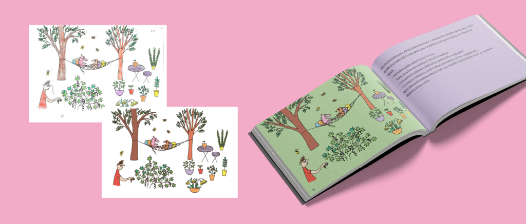 Työ sisälsi tilaajan itse tekemien puuvärikuvitusten digitalisoinnin skaalautuviksi vektoreiksi ja kansien, sisäsivujen sekä kuvitusten taiton. Tavoitteena oli suunnitella ja toteuttaa visuaalisesti selkeä ja kohderyhmälle sopiva taitto, joka tukee kirjan kuvituksia ja tekstiä. Lopputuloksena syntyi painovalmis pdf-tiedosto, jota tilaaja voi hyödyntää kirjan painatuksessa.