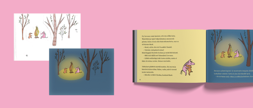 Mantelin Unelma – Lastenkirjan taittaminen is a thesis project completed in the autumn of 2025. This commissioned, illustrated children’s book aimed at elementary school–aged readers, features a 68-page collection of colorful images and an encouraging story about a pink rocking horse named Manteli and her journey toward her dreams.